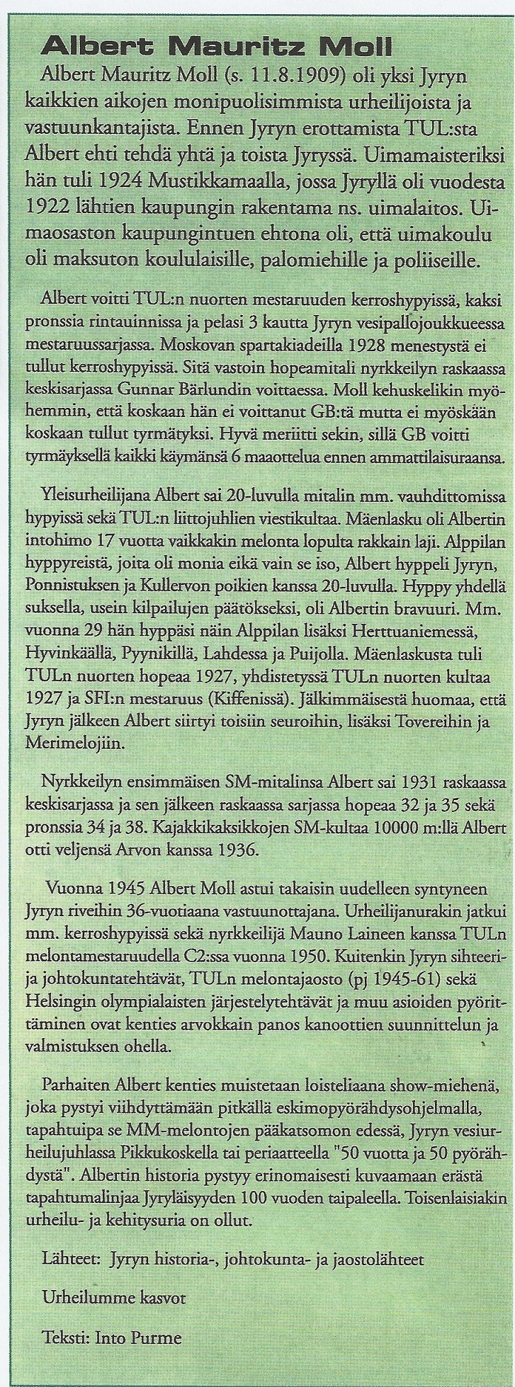 Albert Moll (1907-1989) toimi monissa vastuullisissa tehtävissä Helsingin Jyryssä. Hän oli Jyryn melontajaoksen perustaja ja puheenjohtaja vuosina 1946-1967 ja 1970.